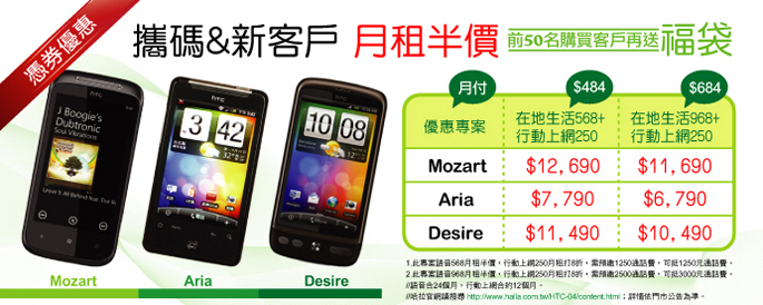 2、此專案語音968月租半價,行動上網250月租打8折,需預繳2500通話費,可抵3000元通話費。